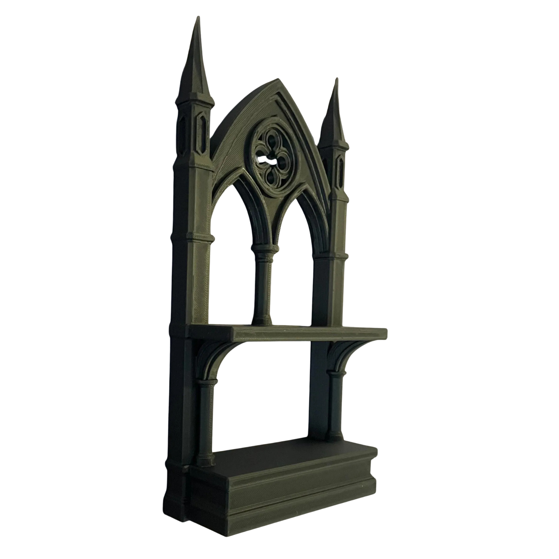 This 9.5" tall gothic cathedral-style mini shelf is perfect for showcasing your crystals, mini plants, tarot decks, figurines, or other treasures. The intricate pointed arches, spires, and ornate quatrefoil design give it an unmistakable dark elegance.